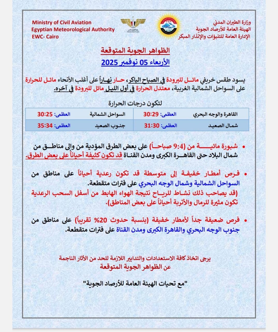 النشرة الجوية المتوقعة عن يوم 5 نوفمبر 2025