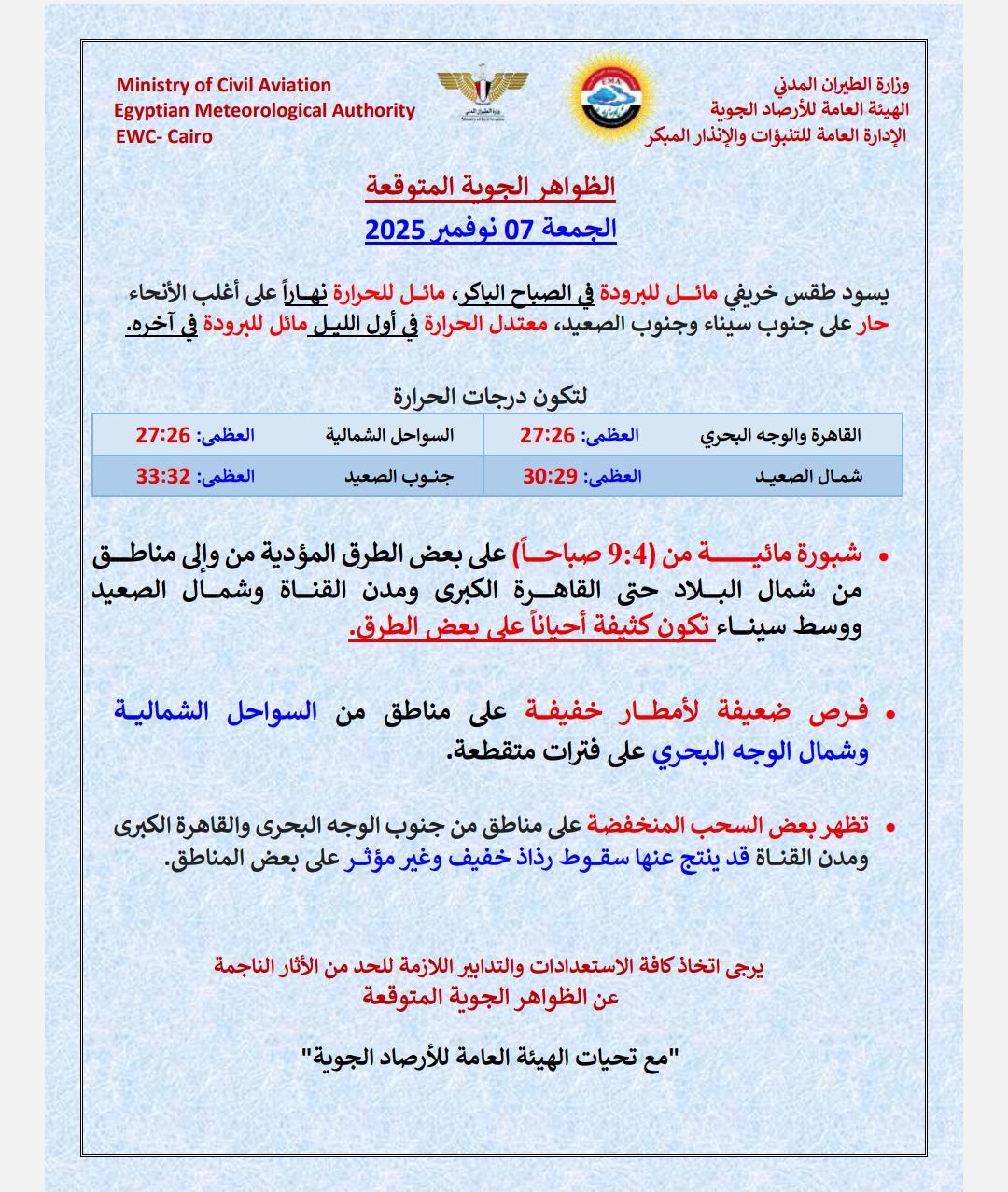 النشرة الجوية المتوقعة عن يوم 7 نوفمبر 2025