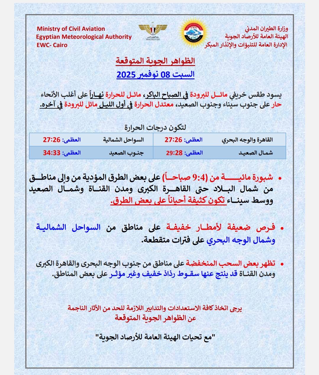 النشرة الجوية المتوقعة عن يوم 8 نوفمبر 2025