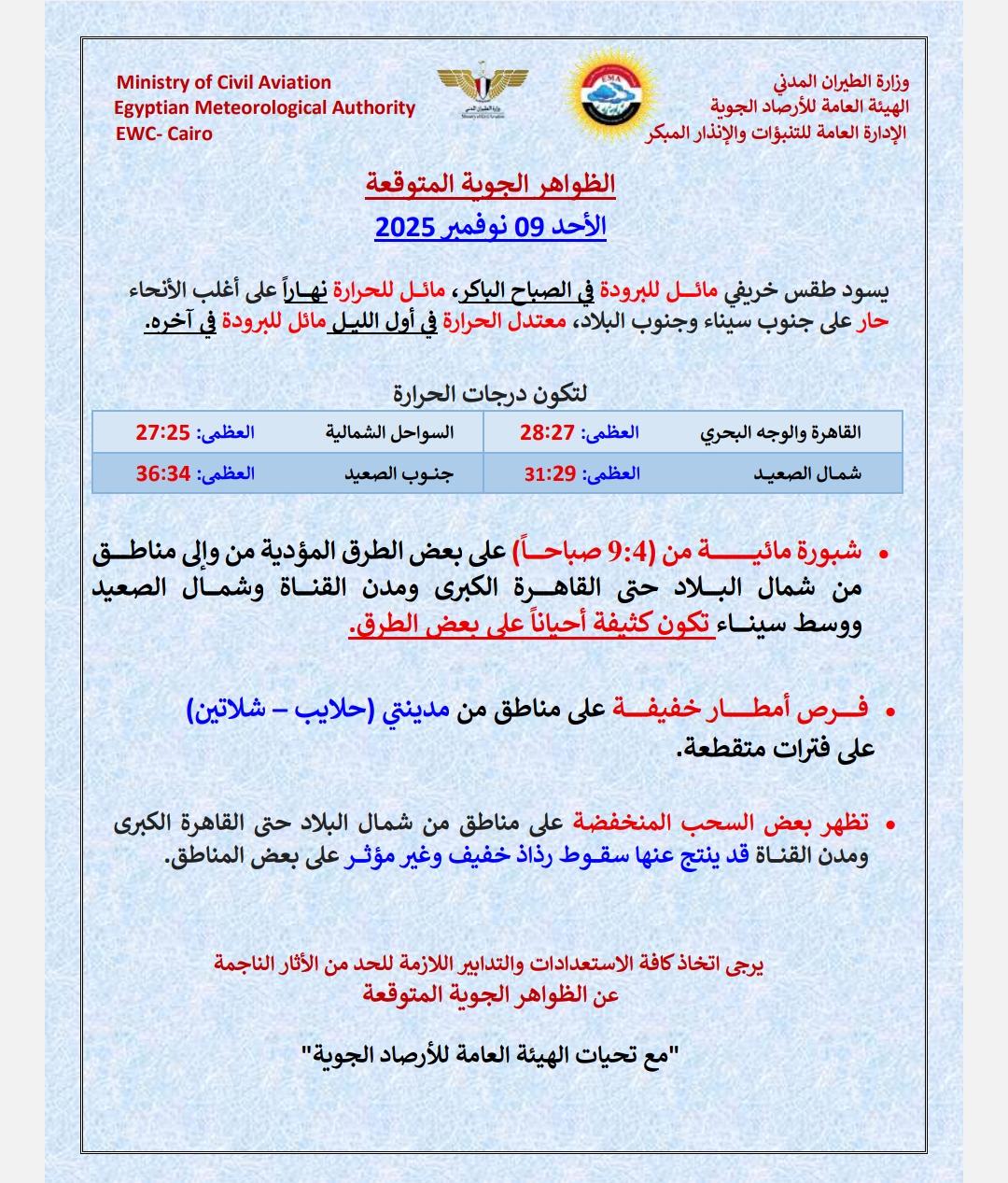 النشرة الجوية المتوقعة عن يوم 9 نوفمبر 2025