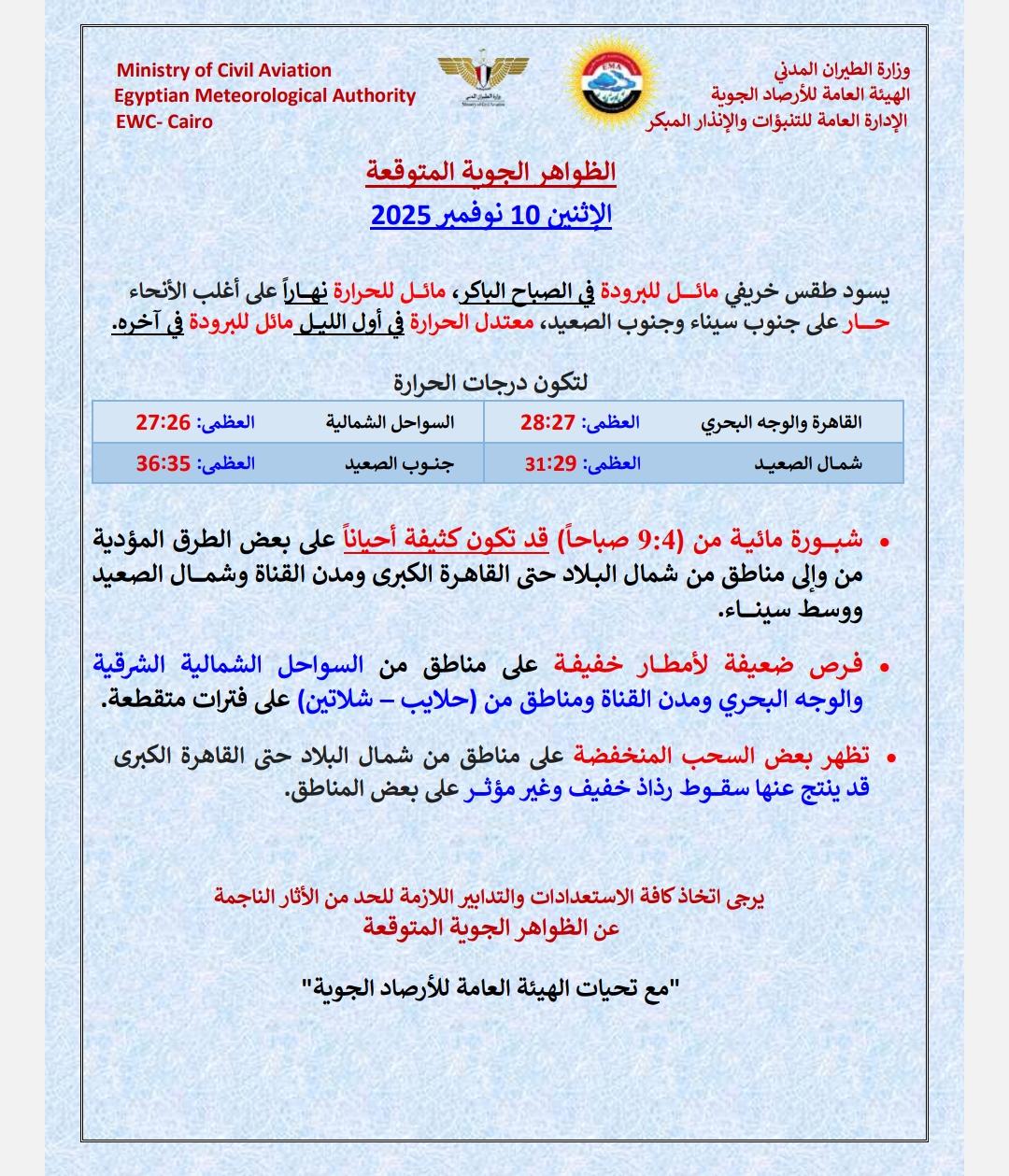 النشرة الجوية المتوقعة عن يوم 10 نوفمبر 2025