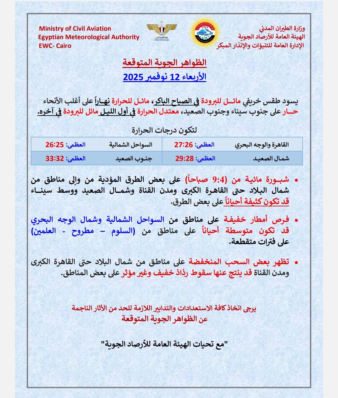 النشرة الجوية المتوقعة عن يوم 12 نوفمبر 2025