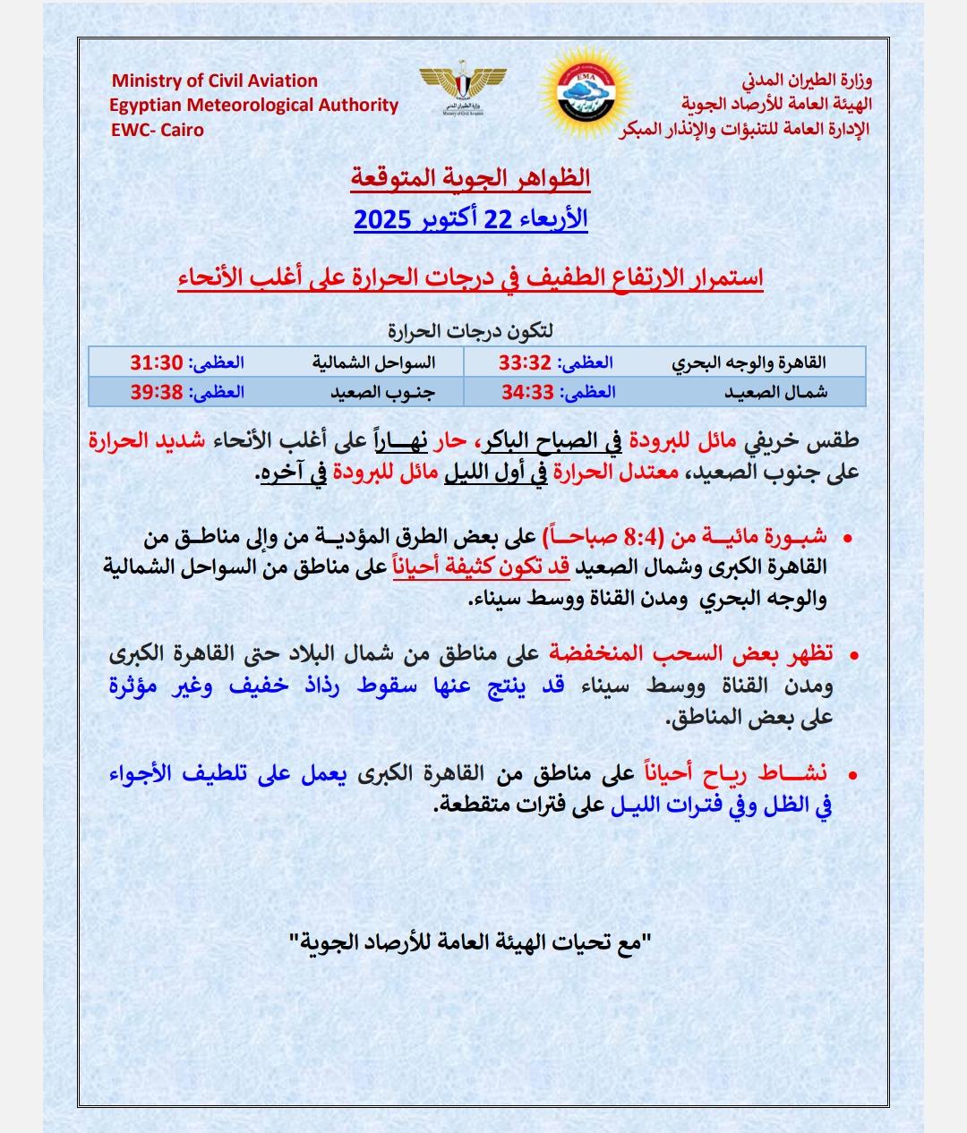 النشرة الجوية المتوقعة عن يوم 22 أكتوبر 2025