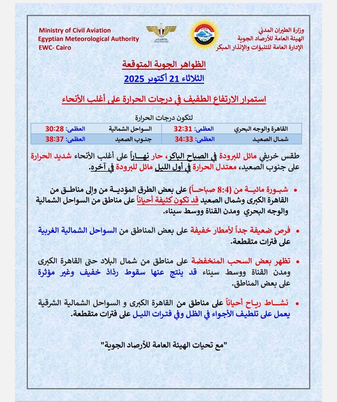 النشرة الجوية المتوقعة عن يوم 21 أكتوبر 2025