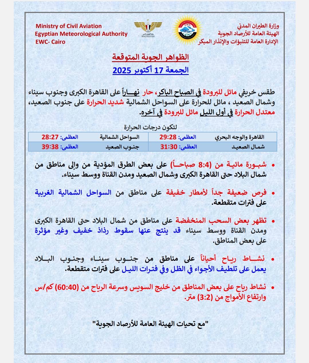 النشرة الجوية المتوقعة عن يوم 17 أكتوبر 2025