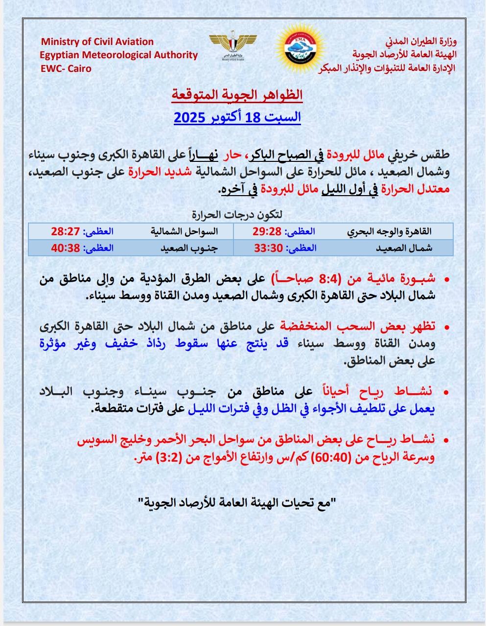 النشرة الجوية المتوقعة عن يوم 18 أكتوبر 2025