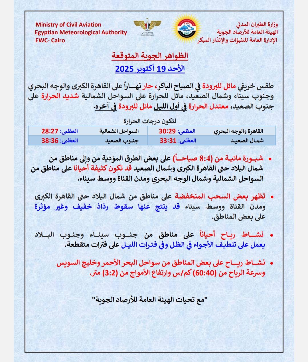 النشرة الجوية المتوقعة عن يوم 19 أكتوبر 2025