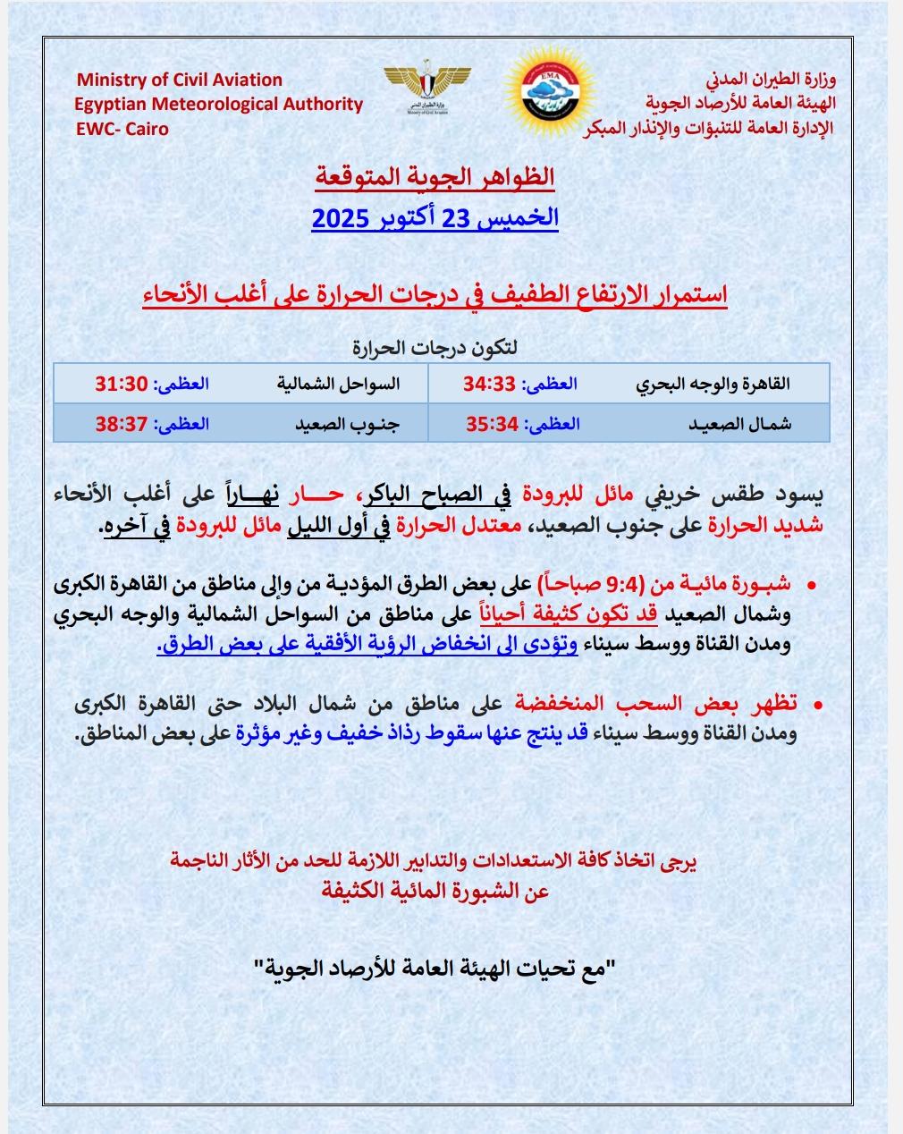 النشرة الجوية المتوقعة عن يوم 23 أكتوبر 2025