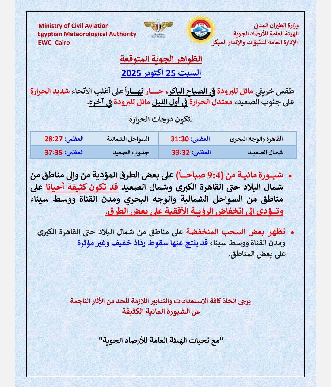 النشرة الجوية المتوقعة عن يوم 25 أكتوبر 2025